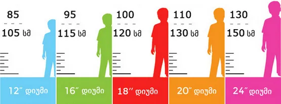 როგორც შეამჩნიეთ, საბავშვო ველოსიპედების არჩევის პრინციპი რამდენადმე განსხვავებულია და ზომის არჩევა ხდება საბურავების დიამეტრის მიხედვით.