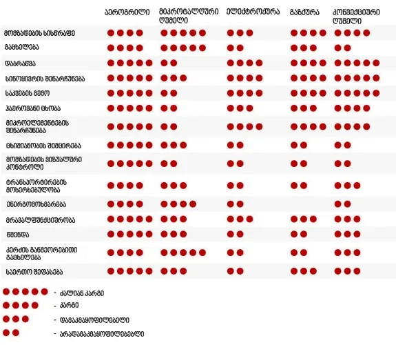 აქ კი მოყვანილია აეროგრილის ფუნქციების შედარება მიკროტალღურ ღუმელთან და სხვადასხვა ტიპის ქურებთან).