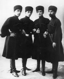 მინაწერი ფოტოზე, რომელზეც გადაღებულია ოთხი შავჩოხოსანი ქართველი ვაჟკაცი - კონსტანტინე გამსახურდია, ვახტანგ კოტეტიშვილი, პავლე ინგოროყვა და ალექსანდრე აბაშელი…